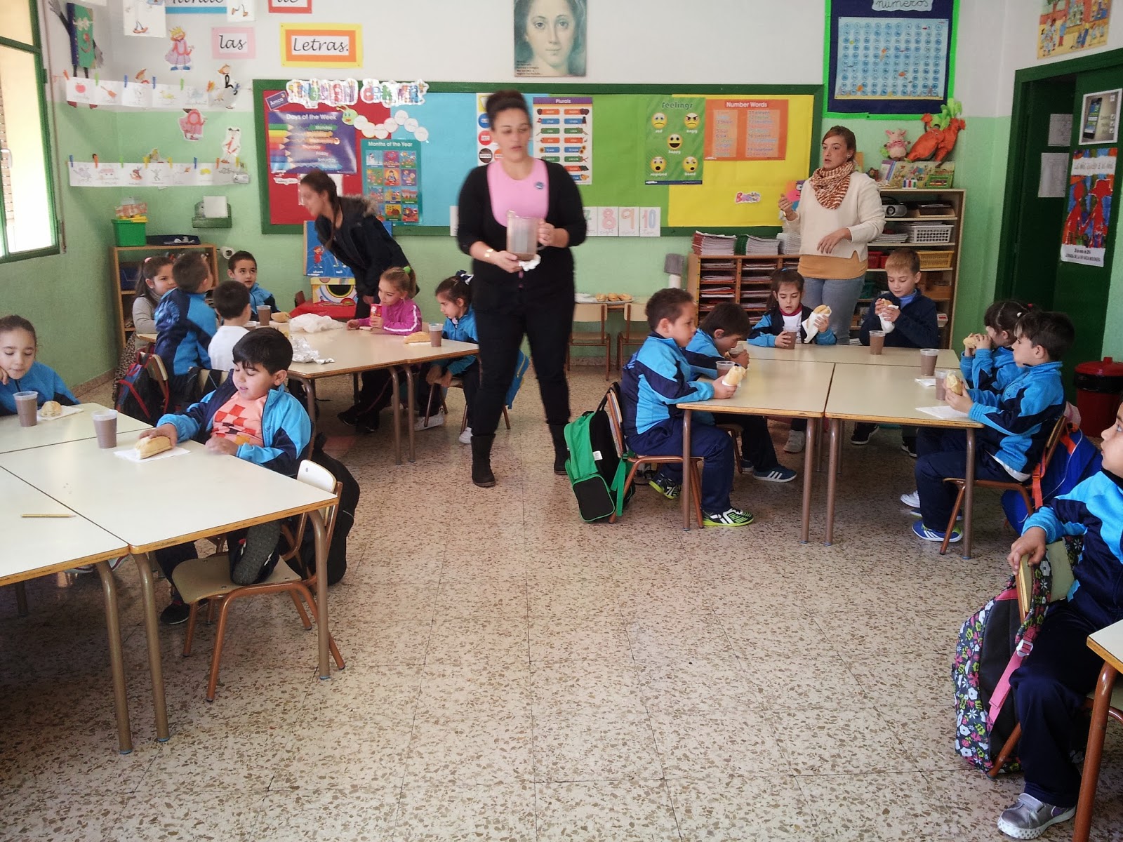 El pasado viernes 7 celebramos en el colegio el Desayuno Solidario. Las madres del AMPA y el PAS, ayudadas por el profesorado, organizaron un desayuno para los niñ@s; pan con aceite y chocolate. Éstos aportaron dos euros que serán repartidos entre Manos Unidas y la ONG "Bajar a la Calle". Se trata de que los alumn@s sacrifiquen un día sus desayunos por otro un poco menos copioso, solidarizándose así con los que no los tienen todos los días. Nos acompañó la Hermana Piedad que lleva 22 años en la misión de Camerún. Gracias a tod@s