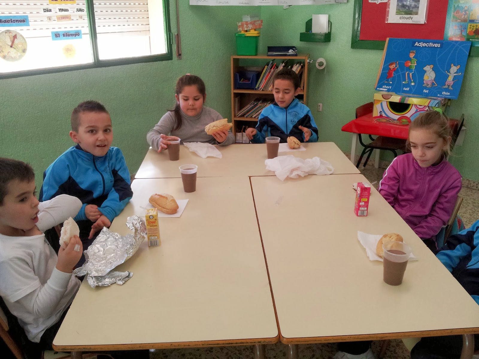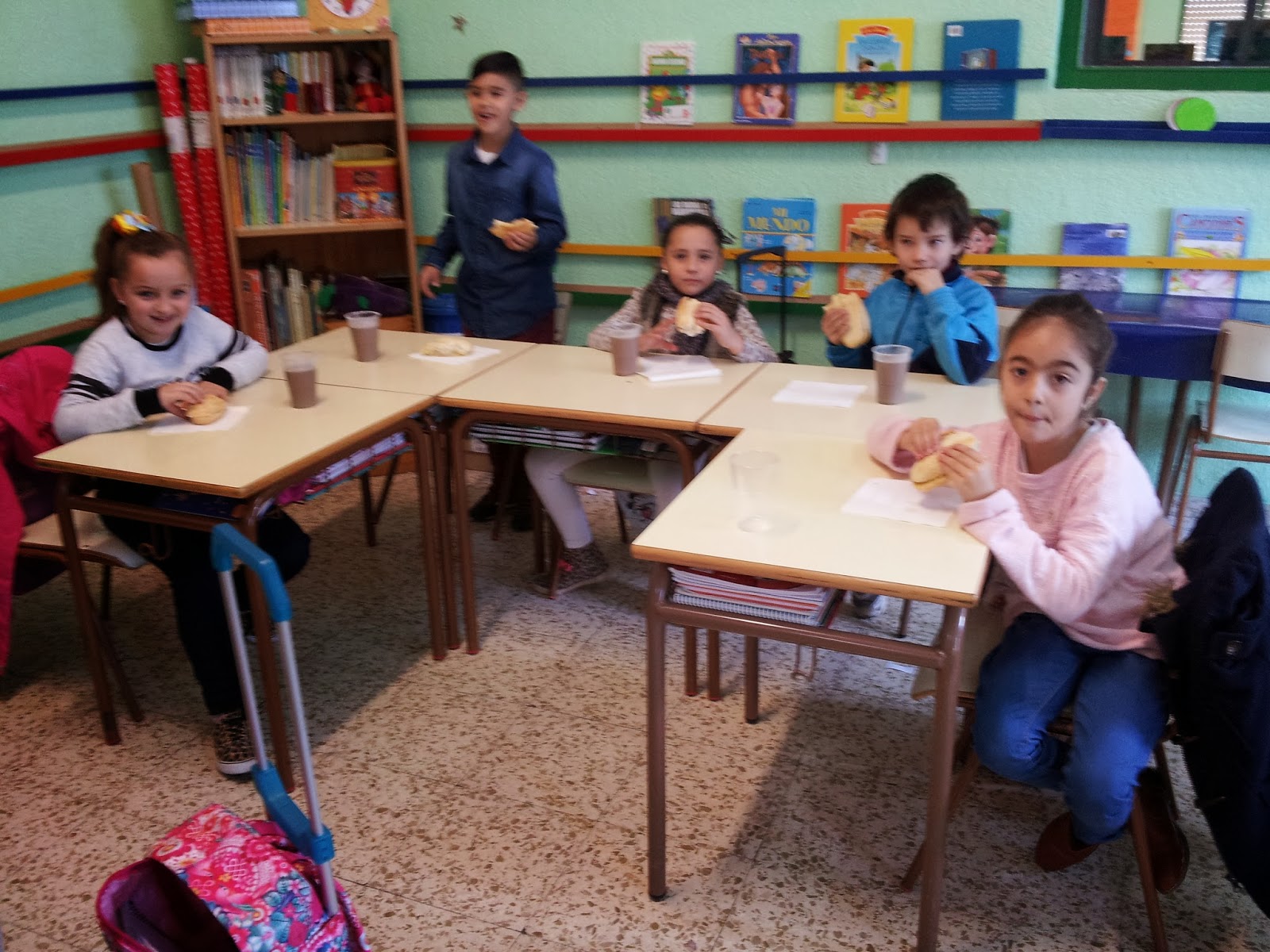 El pasado viernes 7 celebramos en el colegio el Desayuno Solidario. Las madres del AMPA y el PAS, ayudadas por el profesorado, organizaron un desayuno para los niñ@s; pan con aceite y chocolate. Éstos aportaron dos euros que serán repartidos entre Manos Unidas y la ONG "Bajar a la Calle".
